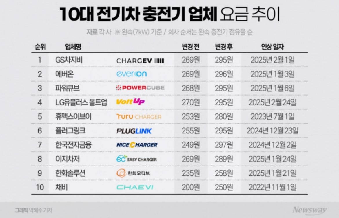 한국 내 10대 전기차 충전기 업체 요금 추이