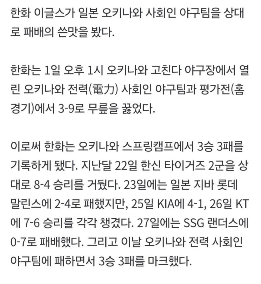 한화, 日 사회인 야구팀에 3-9 '충격패' rh1 0 493 0 2025.03.01 18:45 https://m.sports.naver.com/kbaseball/article/108/0003307635 0