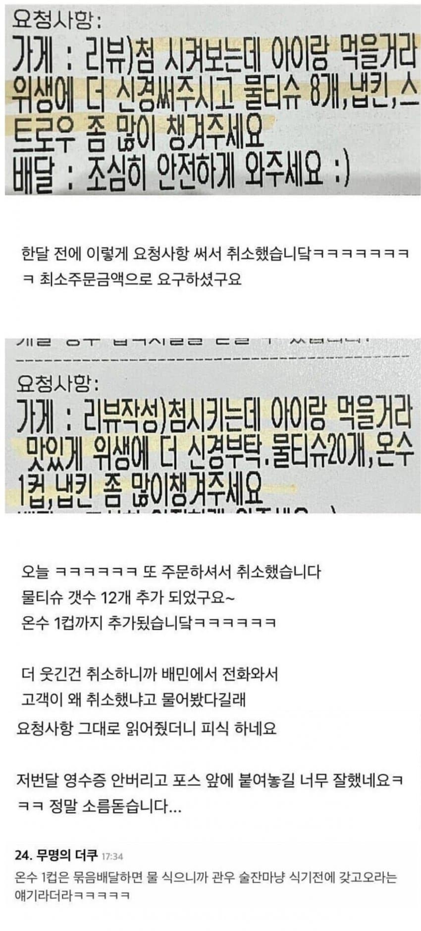 배민에 나타난 온수 1컵 달라는 빌런.JPG