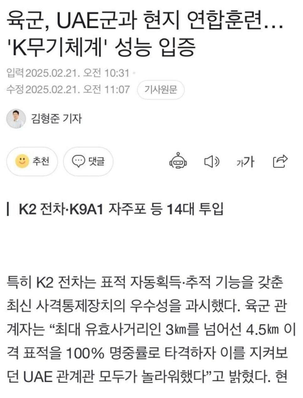 중동에서 뻥카치다가 걸린 한국 전차.jpg rh1 0 270 0 2025.03.01 14:30 k2전차 최대사거리가 3km , 명중률 80%였는대UAE가서 훈련하니 4.5km 에 100% 명중 0