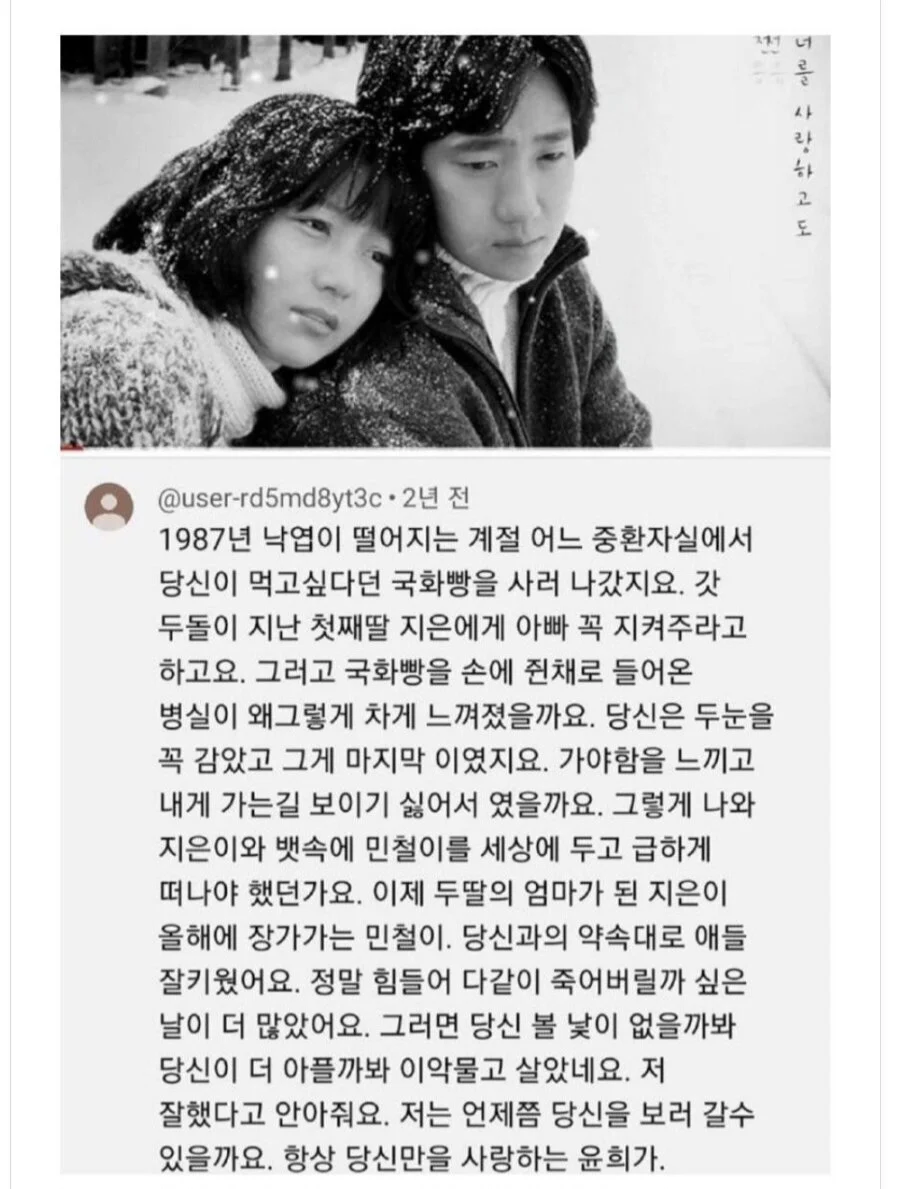 엄마가 유튜브에 쓴 댓글을 본 딸 rh1 0 160 0 2025.03.01 14:45 https://youtu.be/wTe1ljdLt1E 15년 전에 업로드 된 유튜브 영상에 어느날 댓글이 하나 달렸다. 그리고 1년 뒤 달린 댓글 0