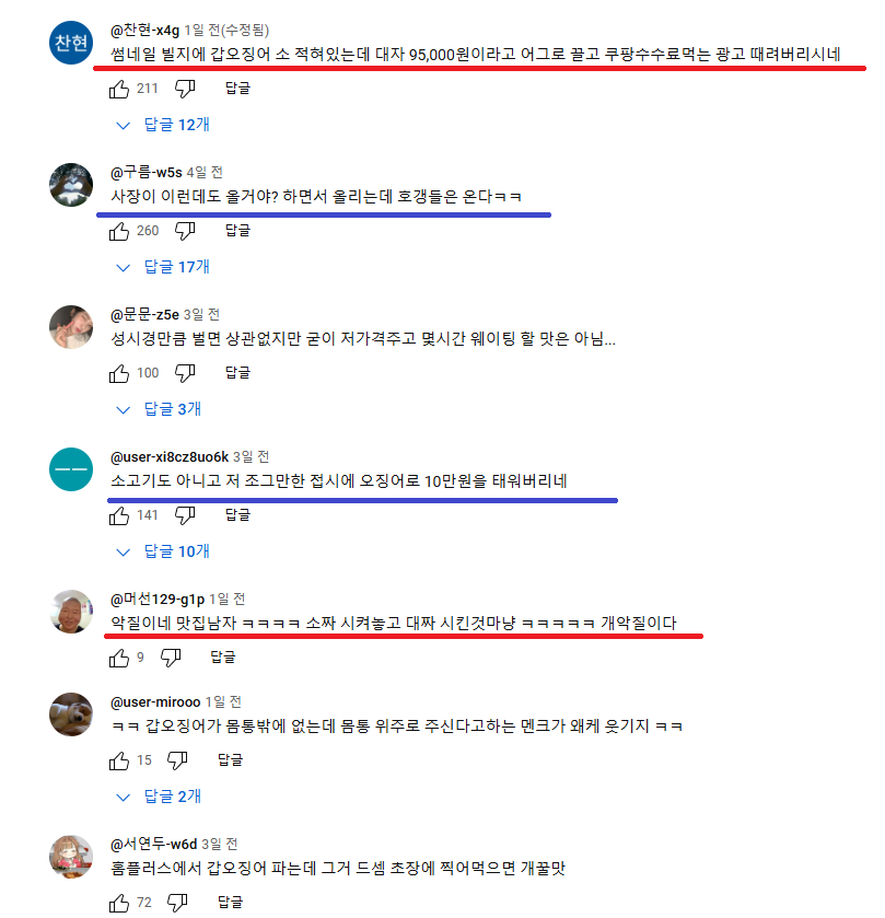 9만5천원 오징어구이로 논란중인 유튜브영상 rh1 0 170 0 2025.02.27 23:15 9만5천원짜리 오징어구이라고 자극적으로 쓰고대자를 주문했다고 적어놨지만 빌지 확대해보면 소자임 진실을 말하는사람들도있지만저 영상에 낚여서 욕하는사람들이 더많음 다른 블로그 글들 찾아보면 국내산오징어인데 양이 괜찮다고함 0