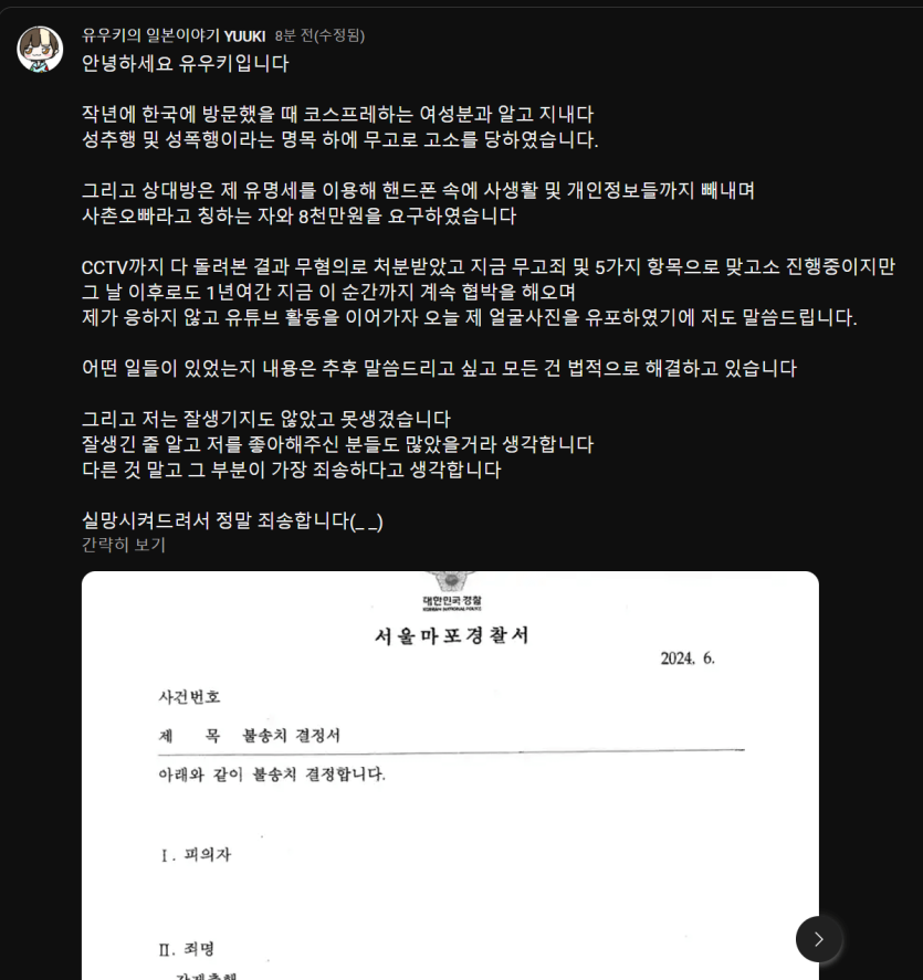 유튜버 '유우키의 일본이야기' 무고죄 고소 및 얼굴 공개