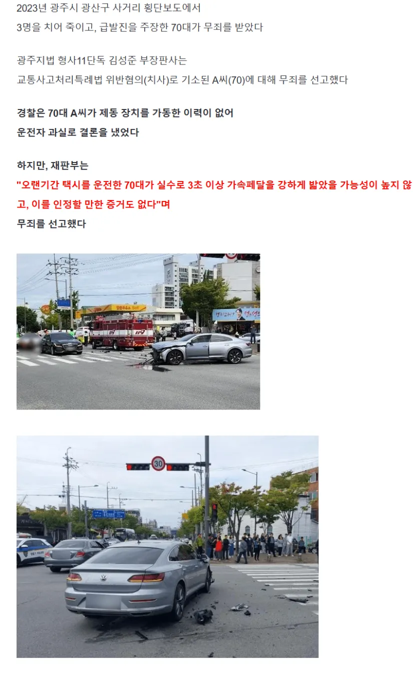 3명 치어죽인 급발진 주장 70대 무죄.