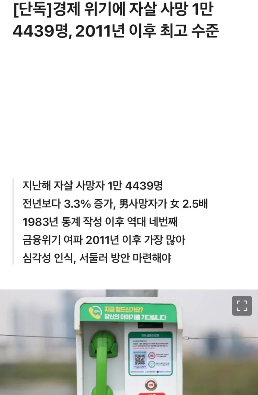 경제 위기에 자살 사망 1만 4439명, 2011년 이후 최고 수준