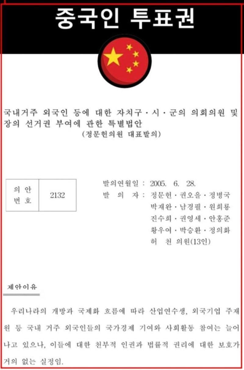 중국인 투표권 발의 한 국회의원 명단