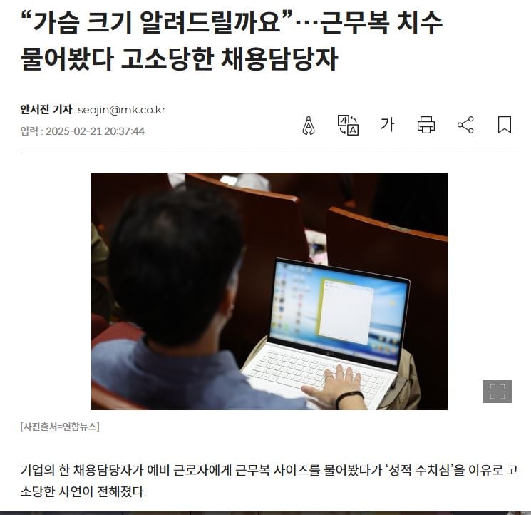 근무복 사이즈 묻자 성추행범 으로 몰려 황당 고소
