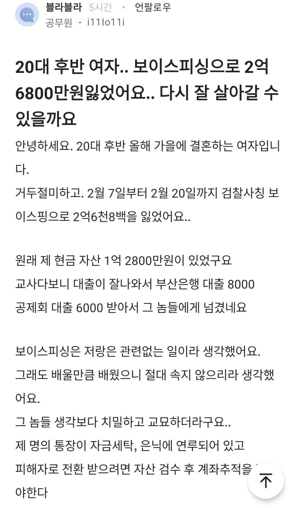 보이스 피싱으로 2억 넘게 사기 당한 20대 여교사 ㄷㄷㄷ rh1 0 191 0 2025.02.23 20:45 20대에 공무원 급여로 1억 넘게 모았으면 진짜 악착같이 살면서 모았을텐데 안타깝네요.. 0