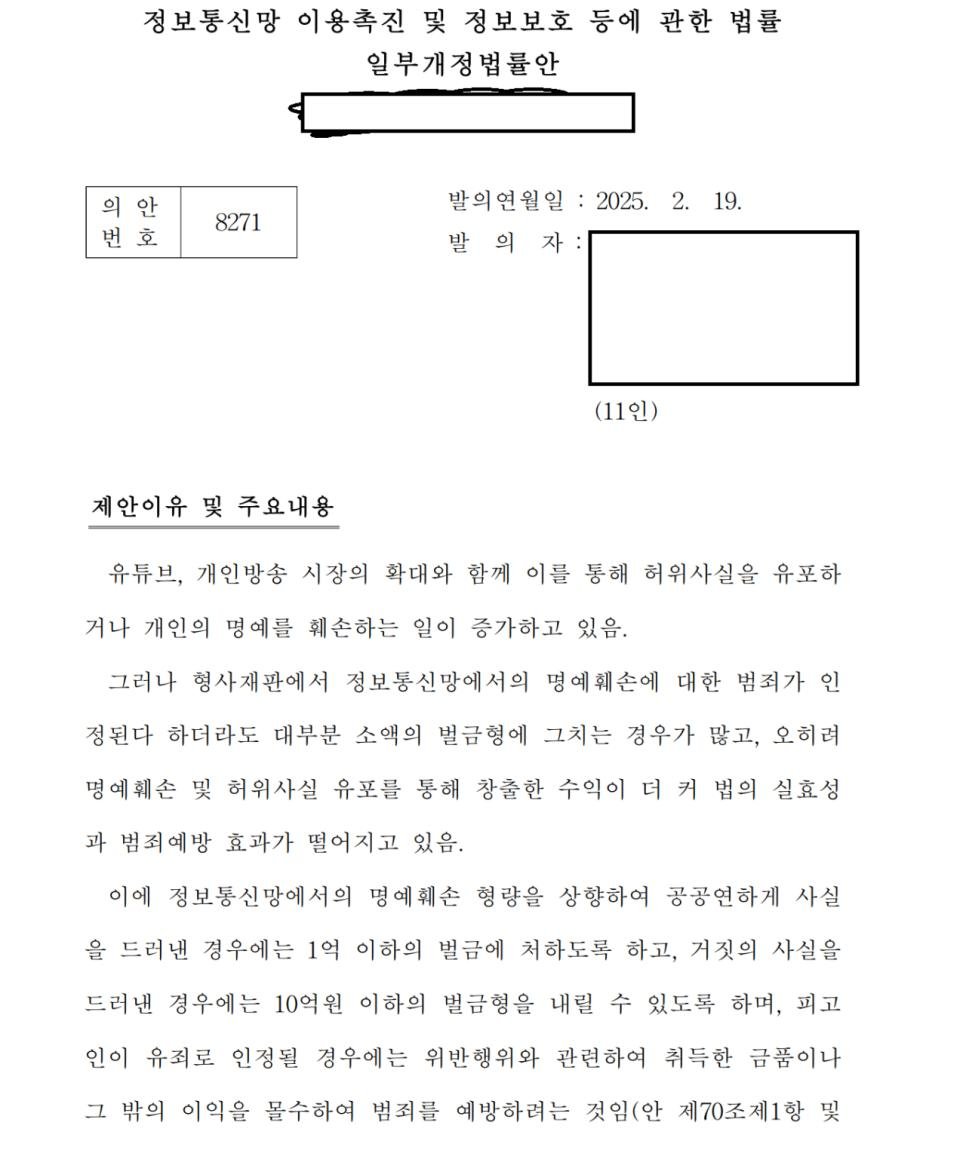 사실적시 명예훼손 처벌 강화 법안 발의