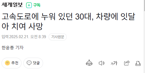 고속도로에 누워 있던 30대, 차량에 잇달아 치여 사망 ㄷㄷㄷ