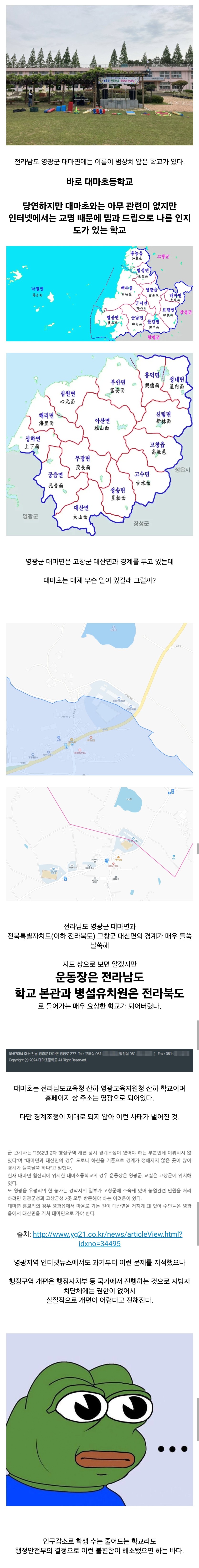 학교 운동장은 전라남도, 학교 본관은 전라북도인 초등학교가 있다?