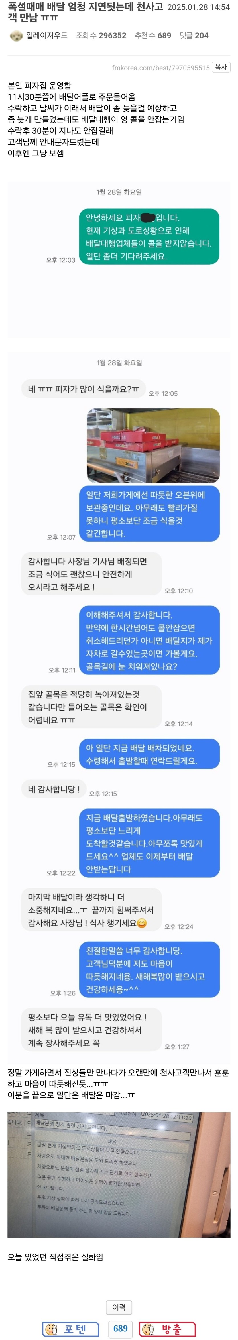 폭설때문에 배달 엄청 지연됬는데 천사 고객 만남