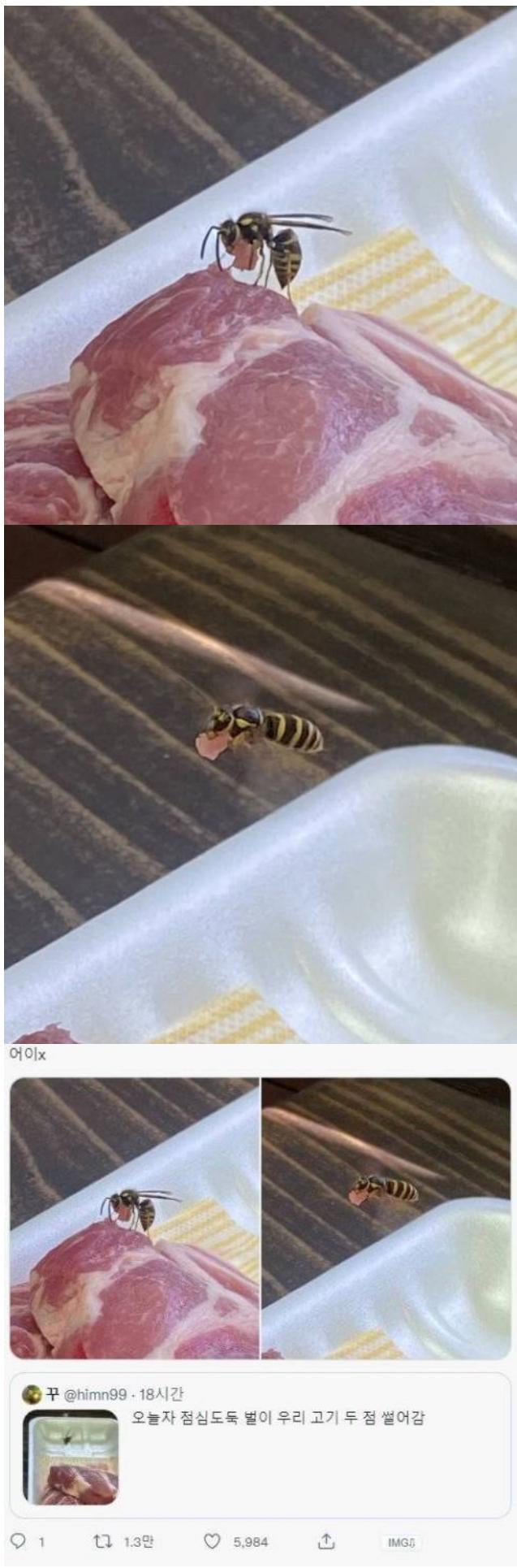 벌이 날아와서 고기 썰어서 훔쳐 도망감