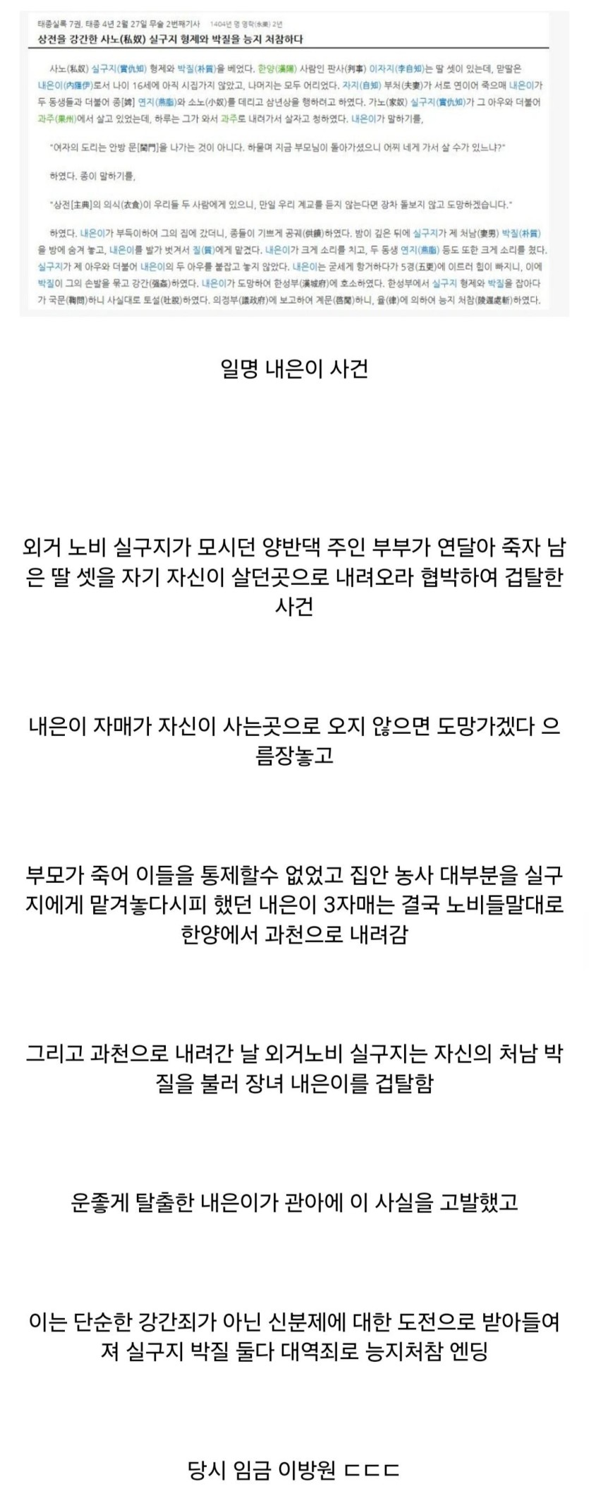 조선시대 노비가 양반 여성을 겁탈하고 받은 형량.