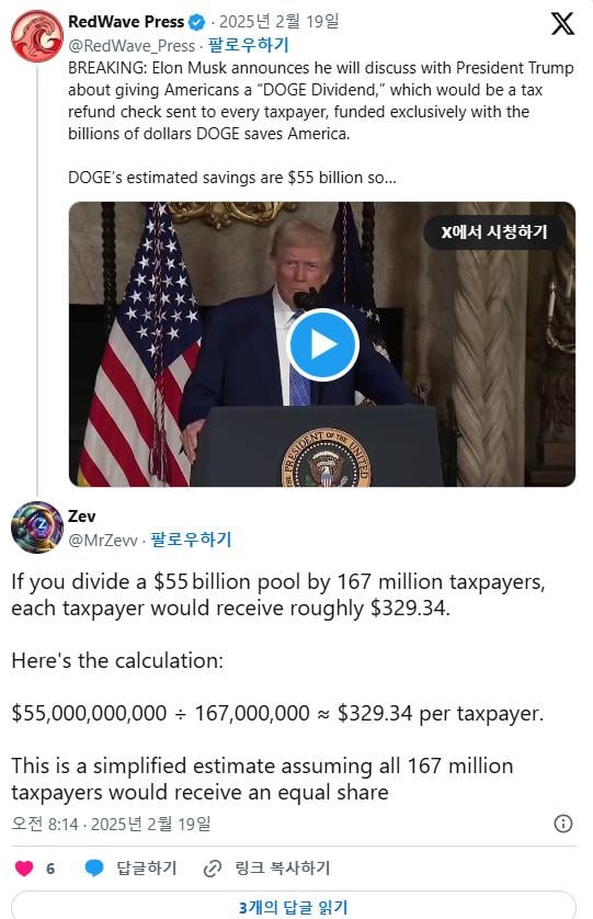 현재 미국 납세자들이 1인당 받을 배당금은 약 330달러 (50만원)
