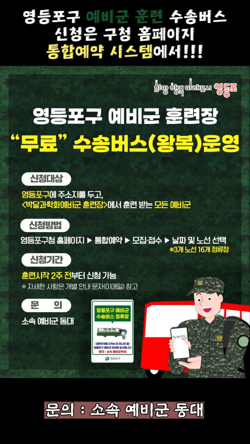 영등포구 예비군 훈련장 무료 수송버스(왕복) 운영