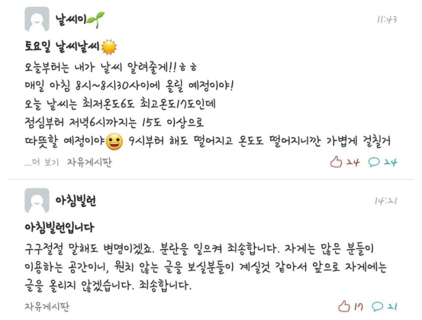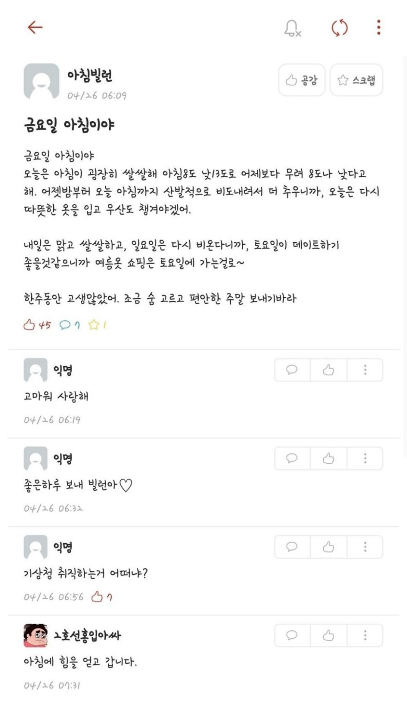 매일 아침 에타에 다정하게 응원 글 올려서 네임드 된 사람