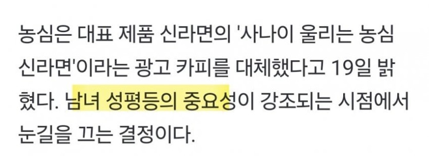 신라면, '사나이 울리면' 삭제... 페미니즘에 앞장서 화제