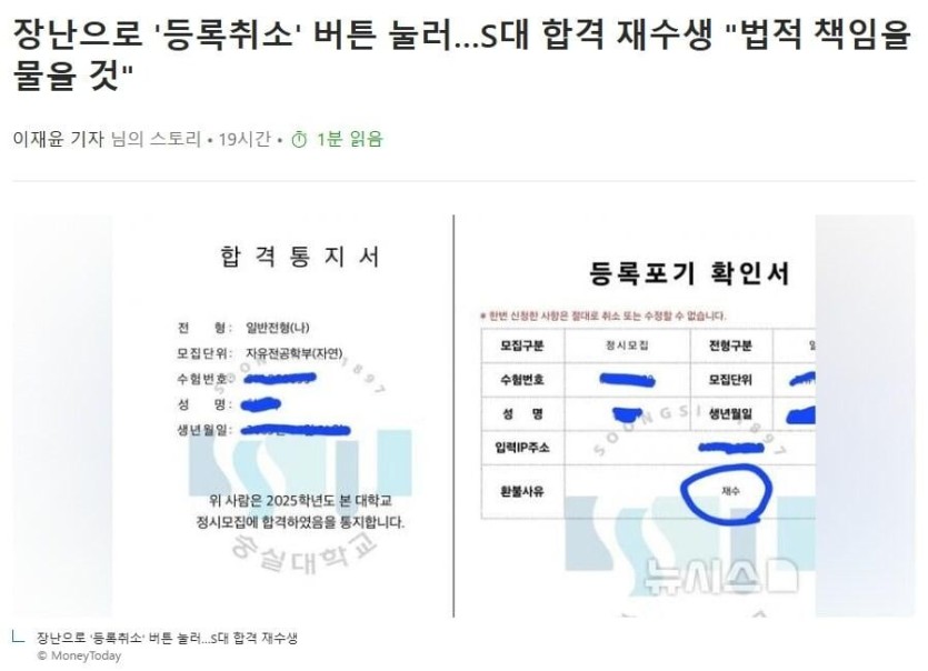 장난으로 '등록취소' 버튼 눌러…S대 합격 재수생 "법적 책임을 물을 것...