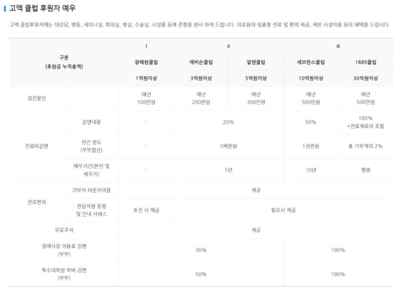 병원에 기부하면 받을 수 있는 vip 혜택 rh1 0 97 0 2025.02.19 00:00 서울 삼성 세브란스 세브란스도 1000만원 이상부터 의료 혜택인데 표에는 안나옴 서울대 0