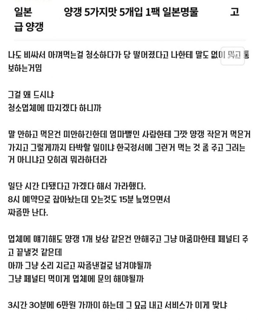 양갱을 맘대로 먹은 청소업체 ㅇㅈㅁ