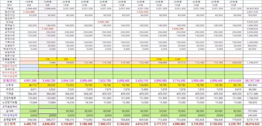 고등학교 교사 1년차 & 10년차 실수령액 rh1 0 145 0 2025.02.18 15:15 1년차 아니면 2년차 1년에 2번 명절상여금 각 120만원 정도 1년에 1번 성과금 300~400만원 정도 정근수당은 1년에 2번 나오는 수당 일년 총 실수령액에 나누기 12하면 평균 월 실수령액 2,791,241원 한 280만원 10년차 월 평균 실수령액 4,001,385원 딱 400만원 0