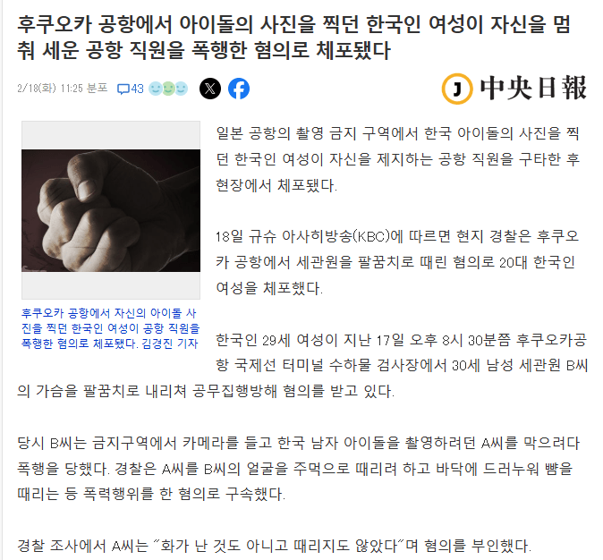 오늘자 일본 공항 직원 폭행한 한국인 rh1 0 120 0 2025.02.18 14:15 29세 한국인 여성금지 구역에서 아이돌 촬영하다 제지당함바로 엘보우 블로 날리고 뺨 갈김본인은 때리지 않았다며 부인중 0