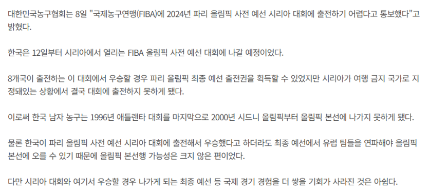 지난 2024 파리 올림픽 남자 농구 아시아 예선이 여행금지국가인 시리아에서 열렸고, 외교부가 출국을 불허하여