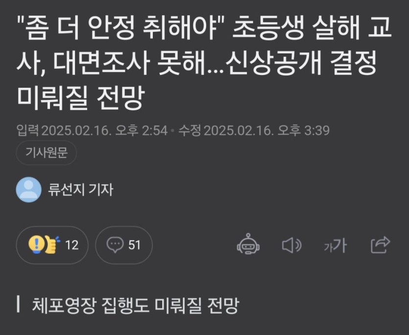 대전여교사 안정취해야... 신상공개 연기.jpg rh1 0 146 0 2025.02.16 19:15 https://n.news.naver.com/article/082/0001311931?sid=102 위중하거나 말을 못하는 상태는 아니라고 함안정 취해야한다는 소견서에 따라체포집행기간도 7일내 -> 30일내로 늘어남(아직 체포안된 상태임) 0