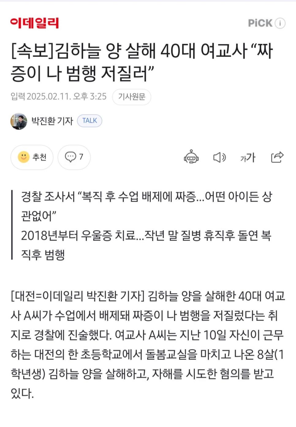 [속보]김하늘 양 살해 40대 여교사 “짜증이 나서 죽였어"