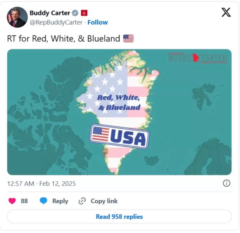 공화당 버디 카터 의원이 그린란드를 매수하고 이름을 '레드, 화이트, 블루랜드'로 바꾸자고 제안