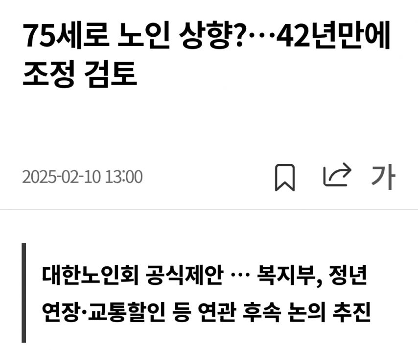 [사회] 75세로 노인 상향...42년만에 조정 검토.jpg rh1 0 830 0 2025.02.12 00:45 https://m.naeil.com/news/read/537517?ref=naver아니 ㅅㅂ 75세까지 일하고 버티라는건가? 돈없으면 죽으라는거냐? 0