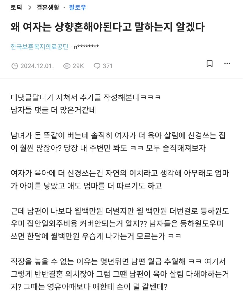 왜 여자는 상향혼해야 된다고 말하는지 알겠다