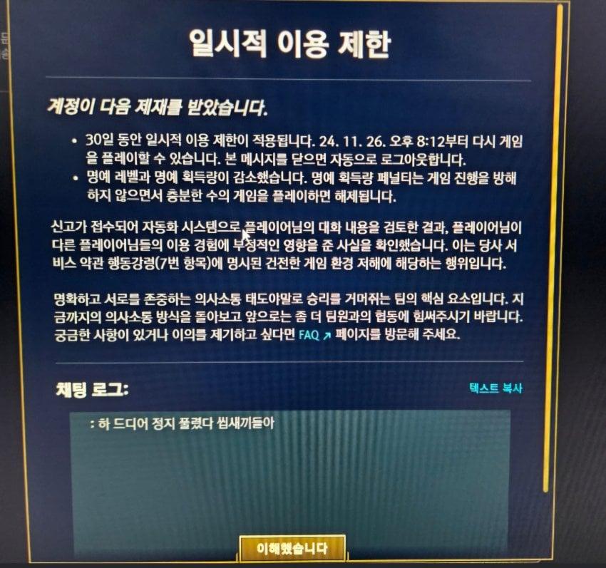 롤 30일 정지 받은 유저 ㄷㄷ