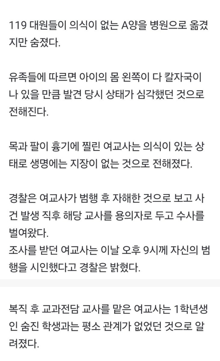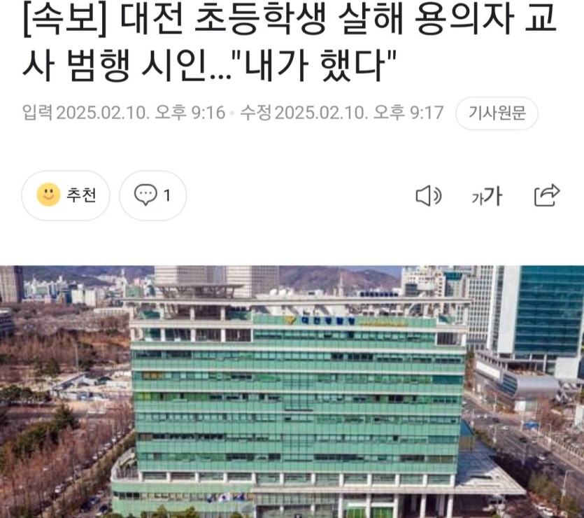 대전 초등학생 살해 용의자 교사 범행 시인…"내가 했다" rh1 0 131 0 2025.02.11 12:45 https://n.news.naver.com/article/025/0003419791?sid=102 범인은 정교사라고 함 0