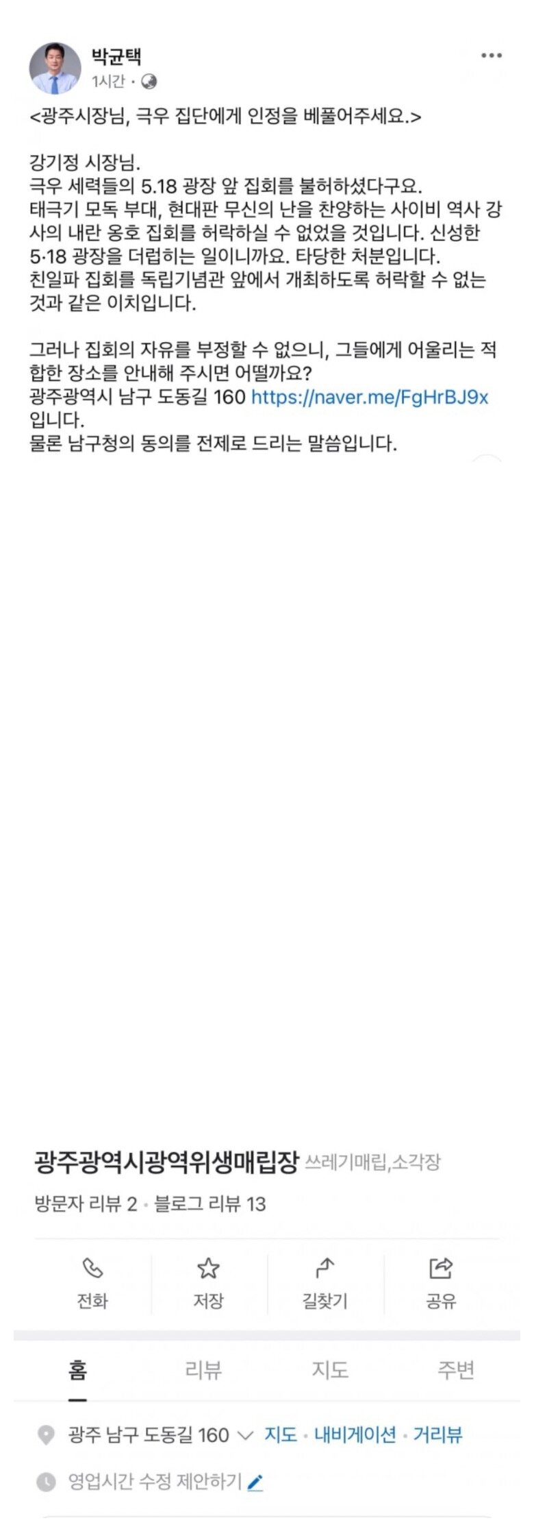 박균택 의원: 광주시장님! 집회의 자유를 부정할수없으니 극우들에게 적합한 장소를 안내해 주시는게 어떨까요?