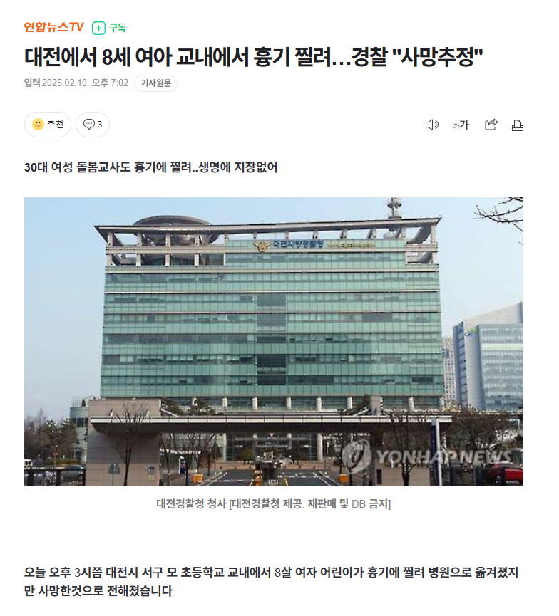대전 초등학교에서 8세 여아 흉기에 찔려