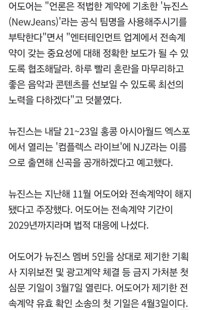 어도어 "NJZ 아닌 뉴진스…전속계약 법적 유효"