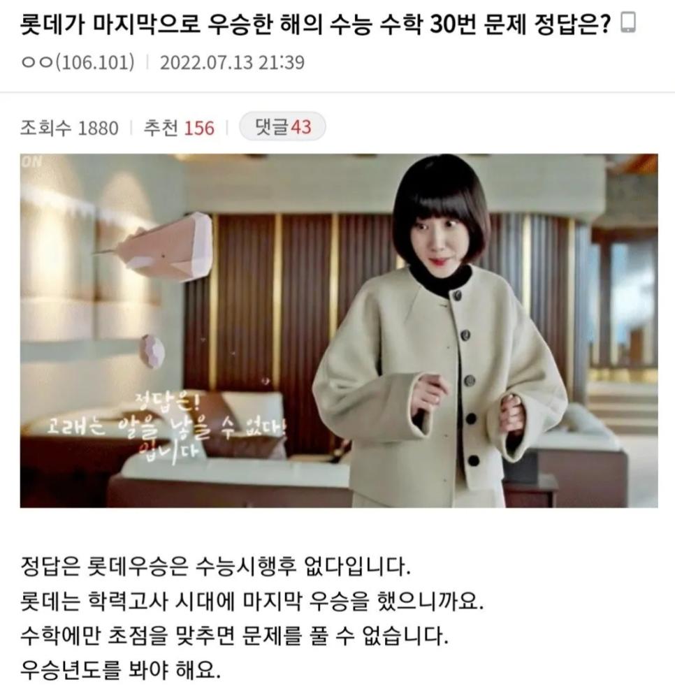 롯데가 마지막으로 우승한 해의 수능 수학 30번 문제 정답은?