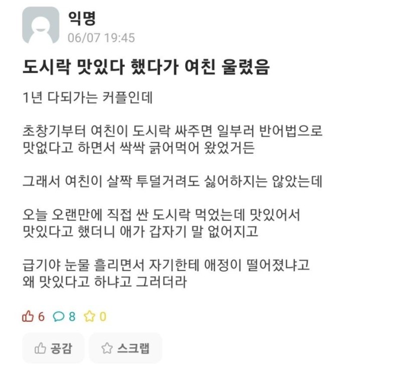 여친이 싸준 도시락 맛있다했는데 여친이 울음.jpg