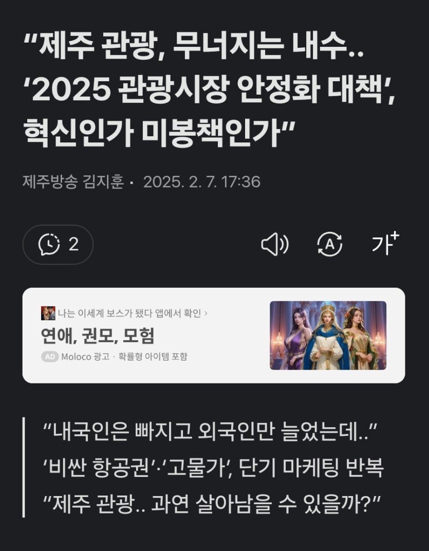 [기타] 무너지는 제주도 관광... '가성비' 강조 rh1 0 81 0 2025.02.09 23:45 여행지원금, 제주관광 팝업스토어, 면세점할인 추진한다고 함 https://v.daum.net/v/20250207173602300 0