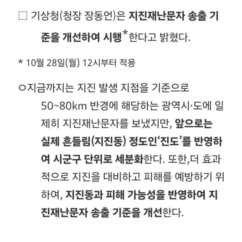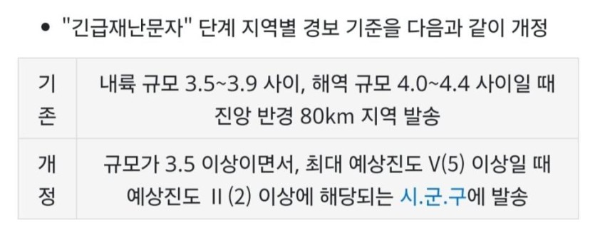최근 개정됐다는 재난문자 발송 기준.jpg rh1 0 98 0 2025.02.09 08:15 2024.10에 개정진도 3.5이상 발생했을때, 근처도 진도 2 이상이면 발송함 서울 예상 지진진도 3 0