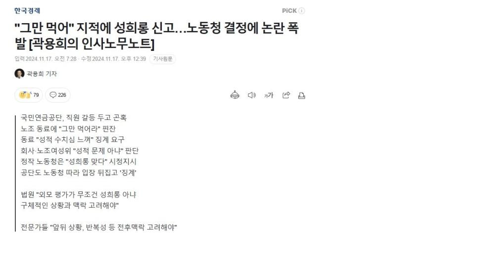 "그만 먹어" 지적에 성희롱 신고.... rh1 0 327 0 2024.11.17 16:15 https://n.news.naver.com/mnews/hotissue/article/015/0005058019?type=series&cid=1088621요약1. 회식 중 "관리 안하시냐 이제 그만 드셔야 하는것 아니냐" 등의 발언2. 노조,징계 위 등 부적절하지만 성희롱 단어는 아니다 판단3. 노동청까지 신고-> 성희롱 맞다 시정 권고4. 징계 받고 소송까지 가서야 성희롱 무죄 판결 받음--> 이제 돼지라 놀리면 소송까지 가야 함 주의하셔야 할 듯 0