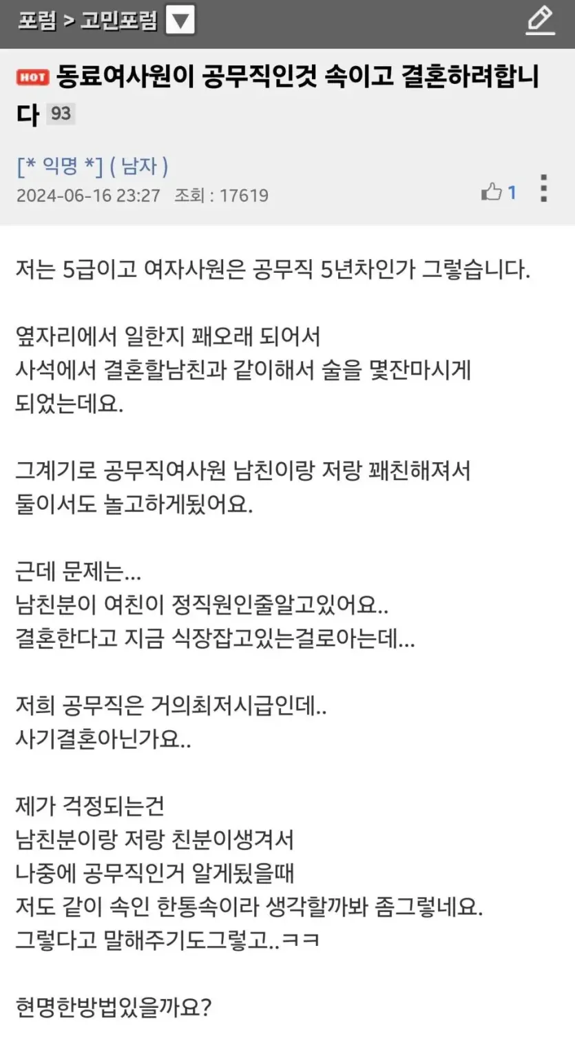 같은 회사 여직원이 결혼하는 것에 대해 배가 아픈 뽐뿌인