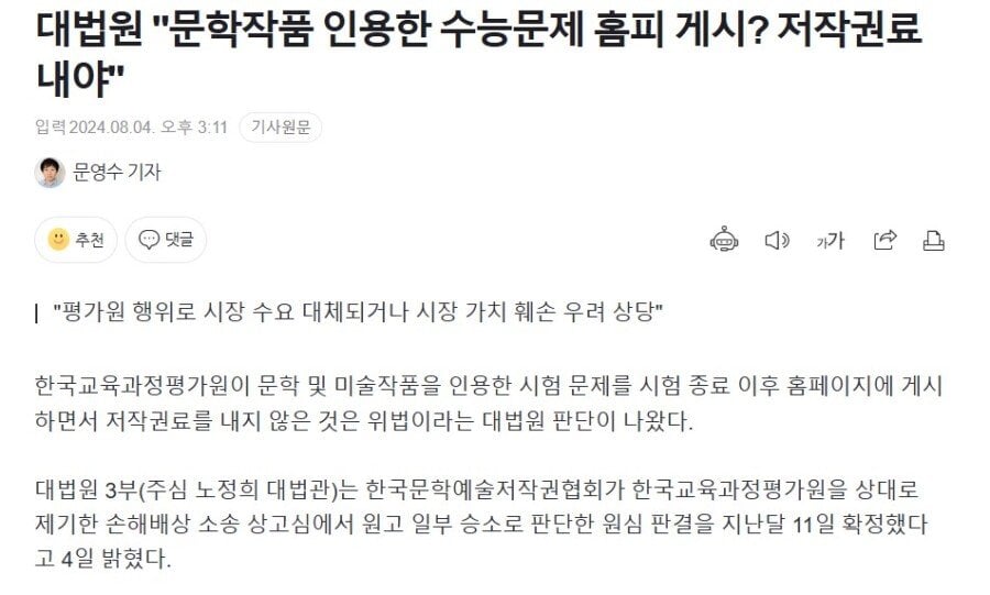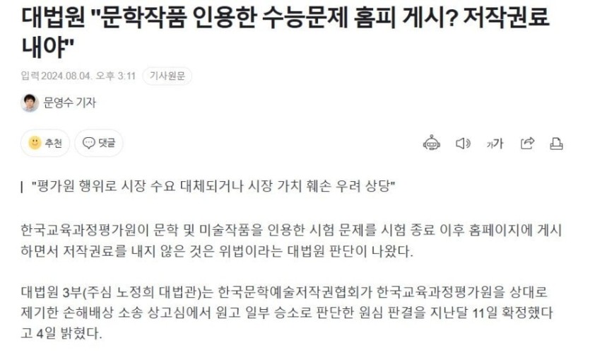 '노벨 문학상' 한강 작품 수능에 못나오는 이유 rh1 0 560 0 2024.10.11 00:15 수능 출제하고 시험지 평가원 홈페이지에 올릴거면 저작권료 내야함ㅋㅋ '노벨 문학상' 한강 작품 수능에 못나오는 이유 0