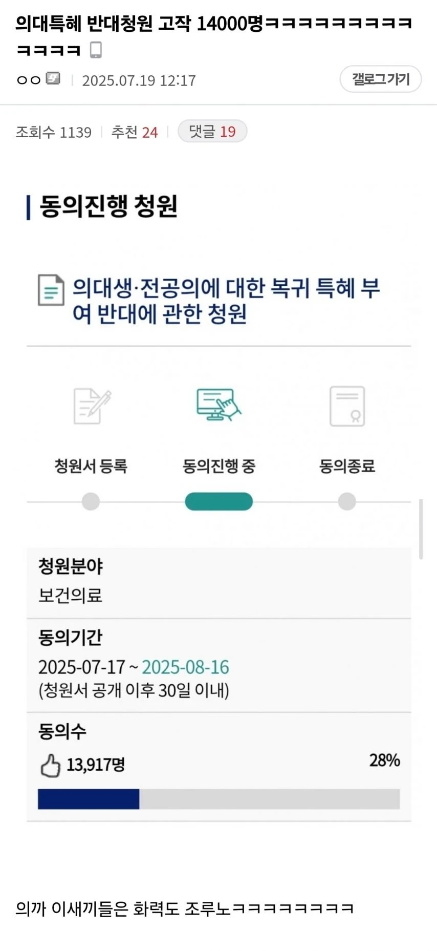 의까들 의대특혜 반대청원 고작 14000명 ㅋㅋㅋ