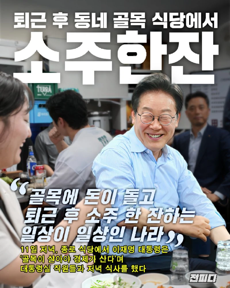 11일 저녁, 종로 식당에서 이재명 대통령은 ‘골목이 살아야 경제가 산다’며 대통령실 직원들과 저녁 식사를 했다.