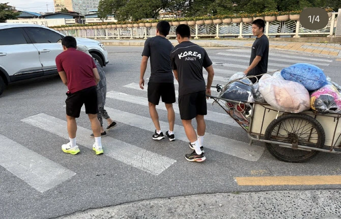 제보자는 “한 할머니께서 혼자 리어카를 끌고 계시는 모습을 보았다”며 “(그 순간) 머리가 짧고 군인(ROKA) 티셔츠를 입은 젊은 남자 여럿이 뛰어와 할머니를 부축하고 리어카를 끌어주었다”고 전했다.
