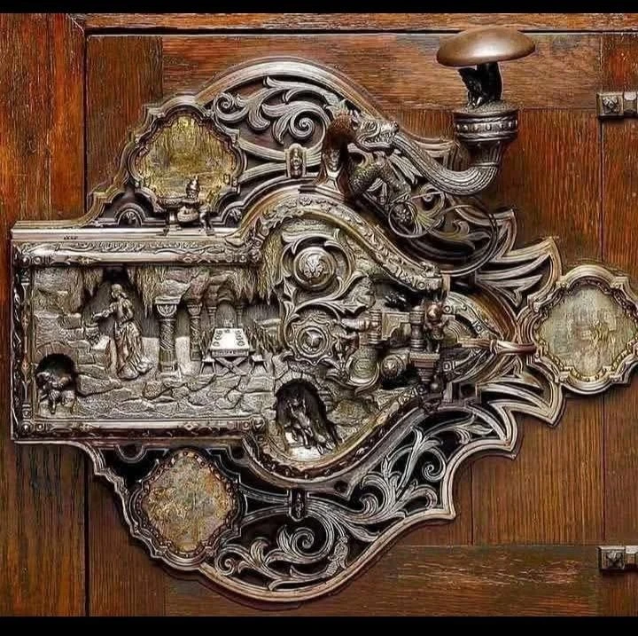 A door lock created in 1911 by the German locksmith Frank L. Koralewsky (1872-1941). It is made of iron, gold, silver and copper, and depicts the fairy tale "Snow White and the Seven Dwarfs".