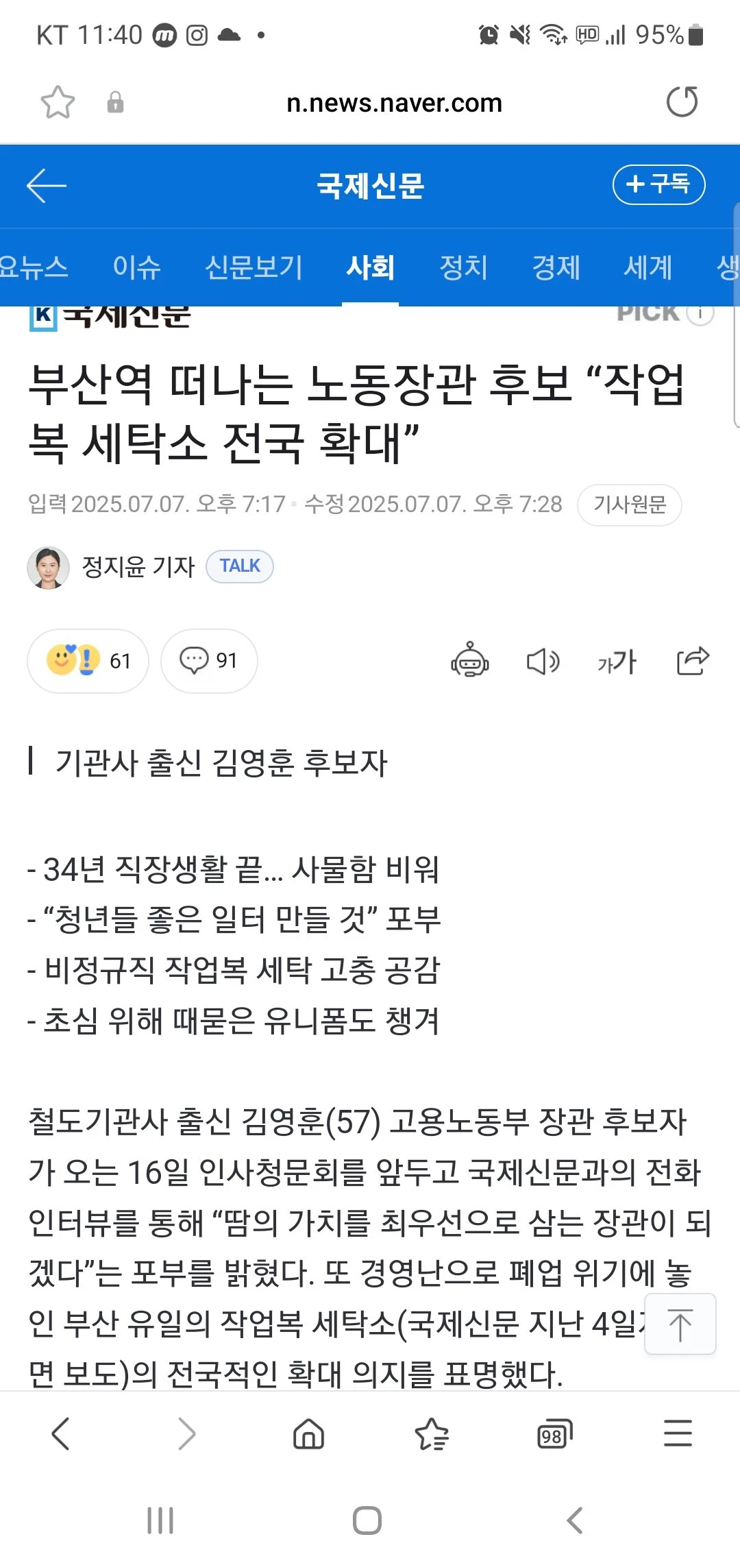 부산역 떠나는 노동장관 후보 “작업복 세탁소 전국 확대”